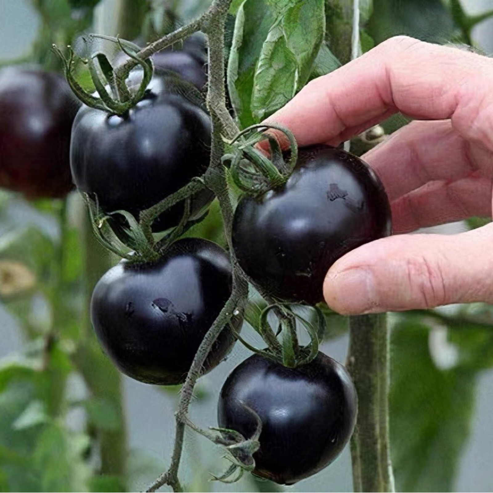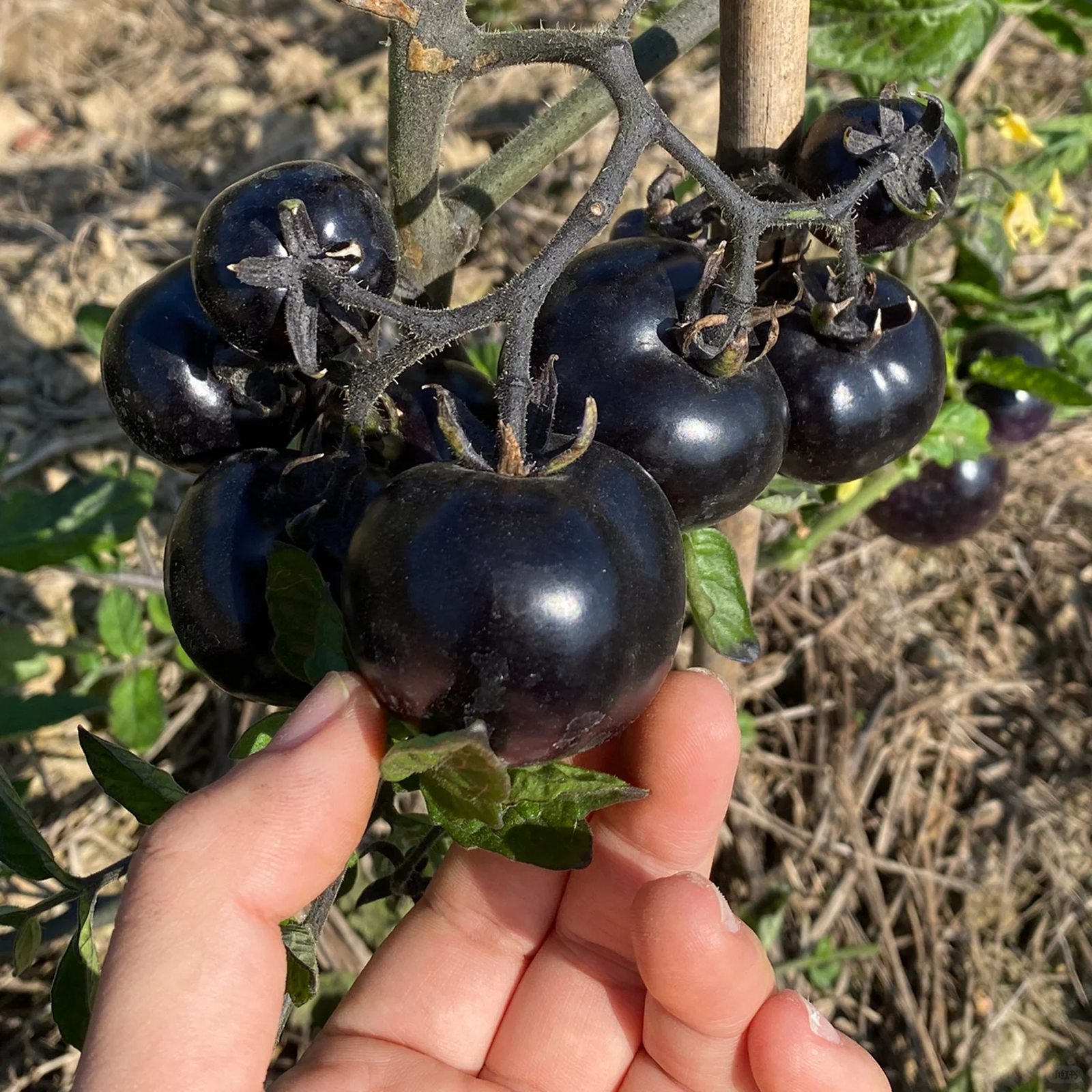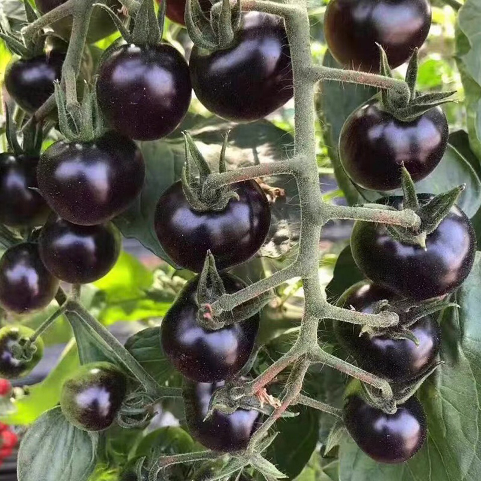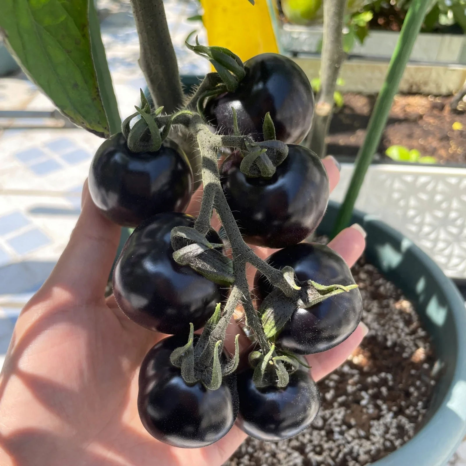 🍅Nutritional,this tomato has high anthocyanin, lycopene and vitamin and other nutrients. ✨Beautiful, the fruit is as glossy as a black pearl, round and flawless, black to dark brown in color.🫡 Harvesting, not easy to crack fruit, cluster harvesting, continuous bearing ability, early maturing, single fruit about 25-30g. 🌱Plant adaptability, disease resistance and beauty of both the characteristic variety.