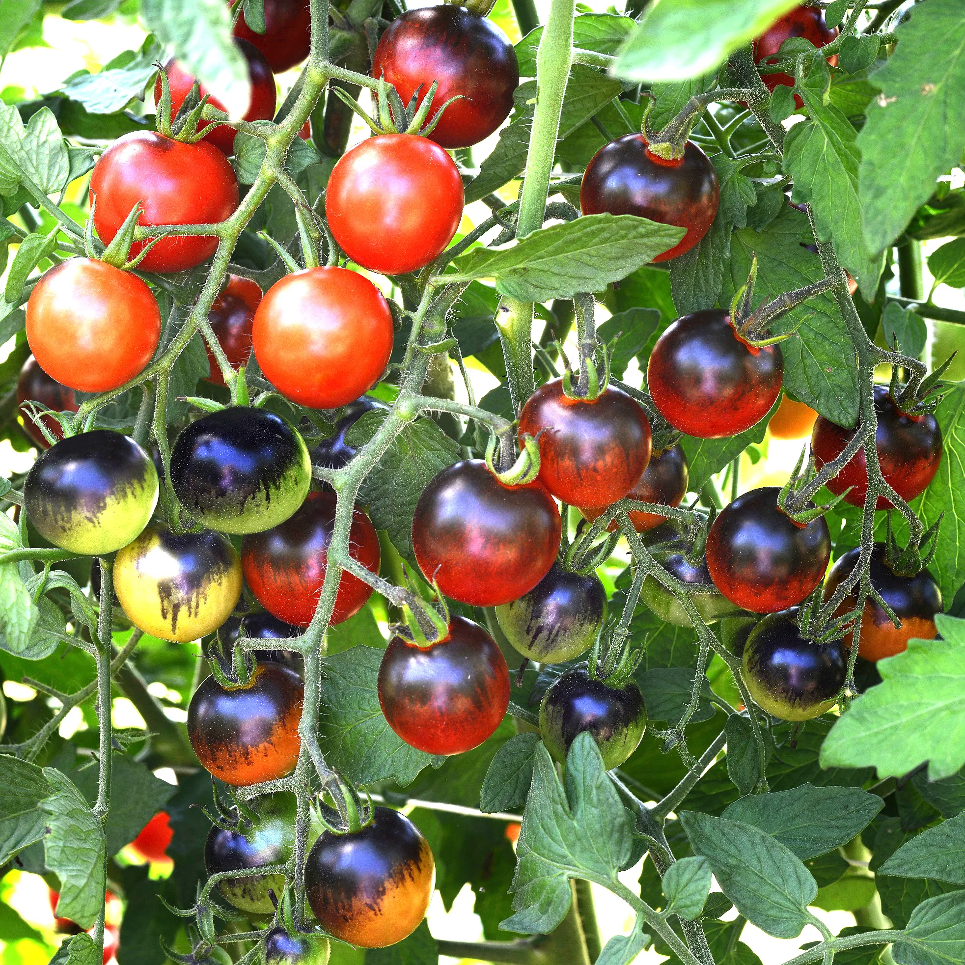 A colorful and tasty hybrid tomato with deep indigo to black coloring. The cherry tomato fruits form in nice clusters of 10-20, with a juicy, tangy flavor. This variety is a hybrid so you can expect consistent fruit quality. Indeterminate growth can produce large crops!