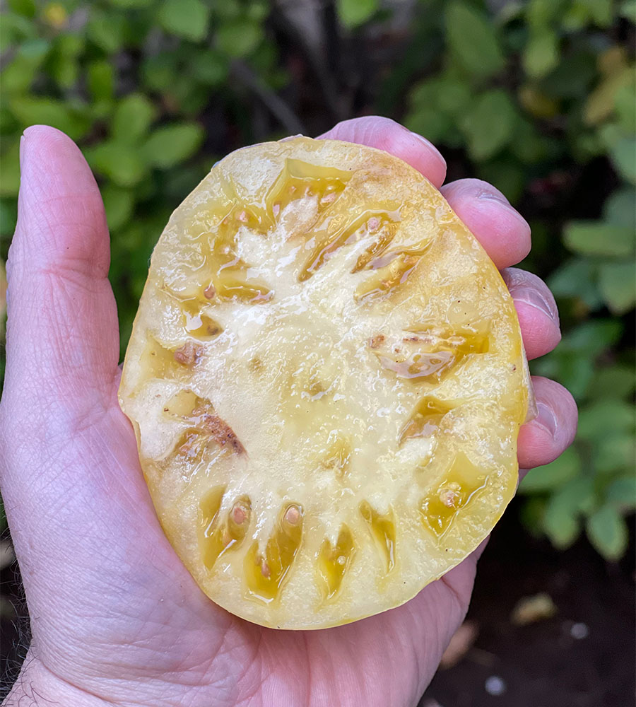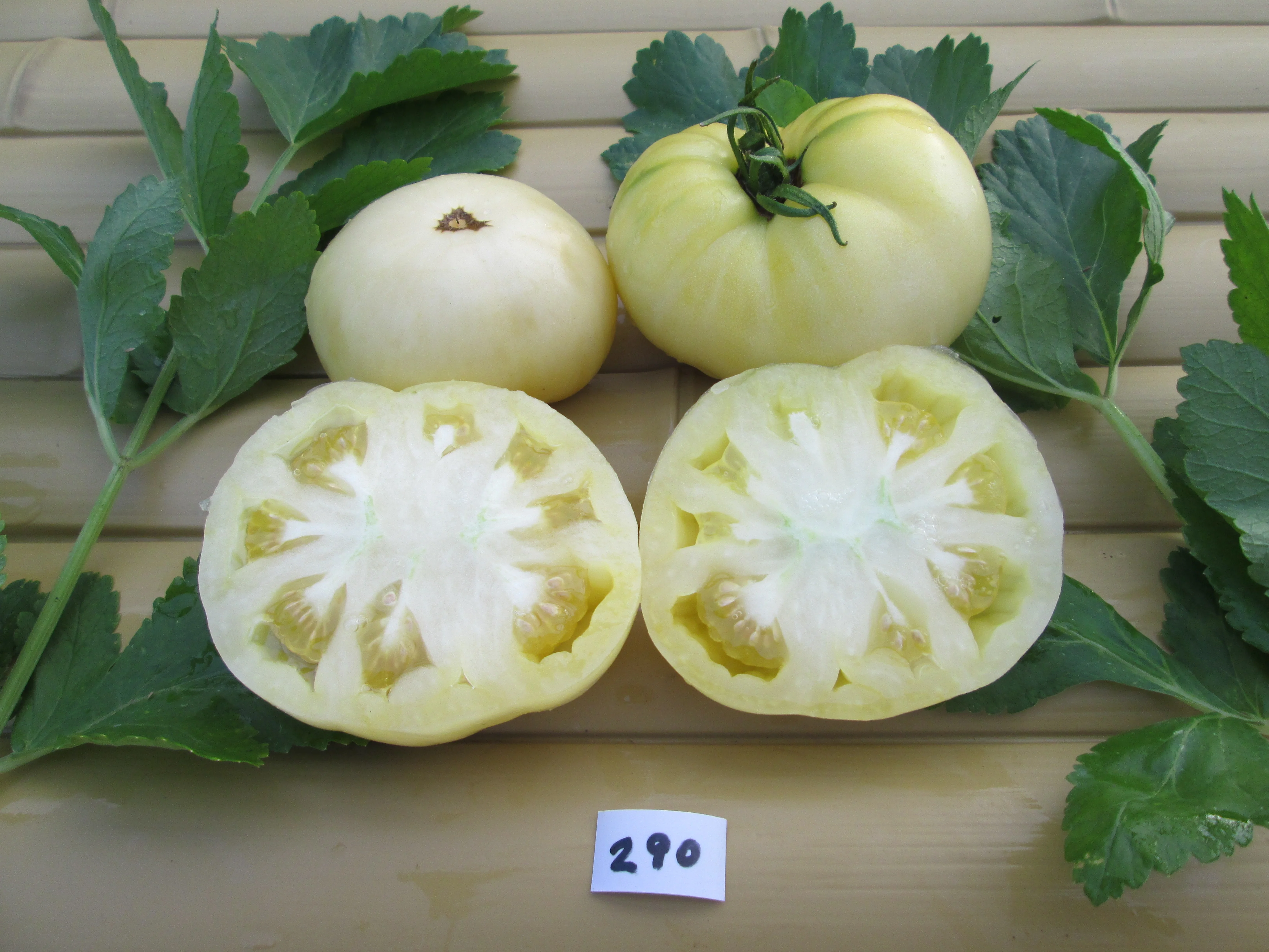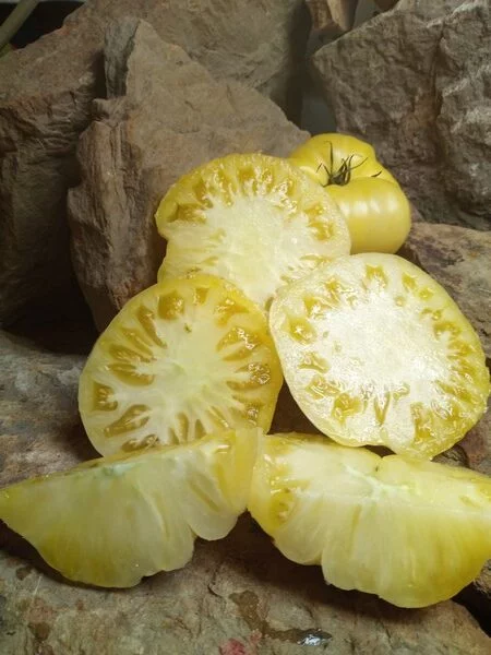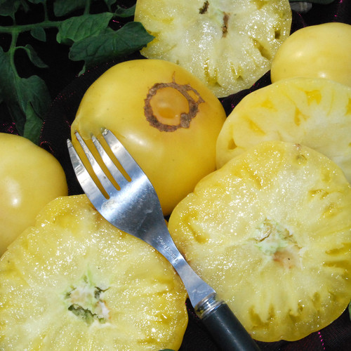 Pale yellow-white 8 ounce fruits with a pretty blush of pink on the blossom end. Color will darken proportionately with the amount of sun exposure. Flavor is sweet, rich, and mild.